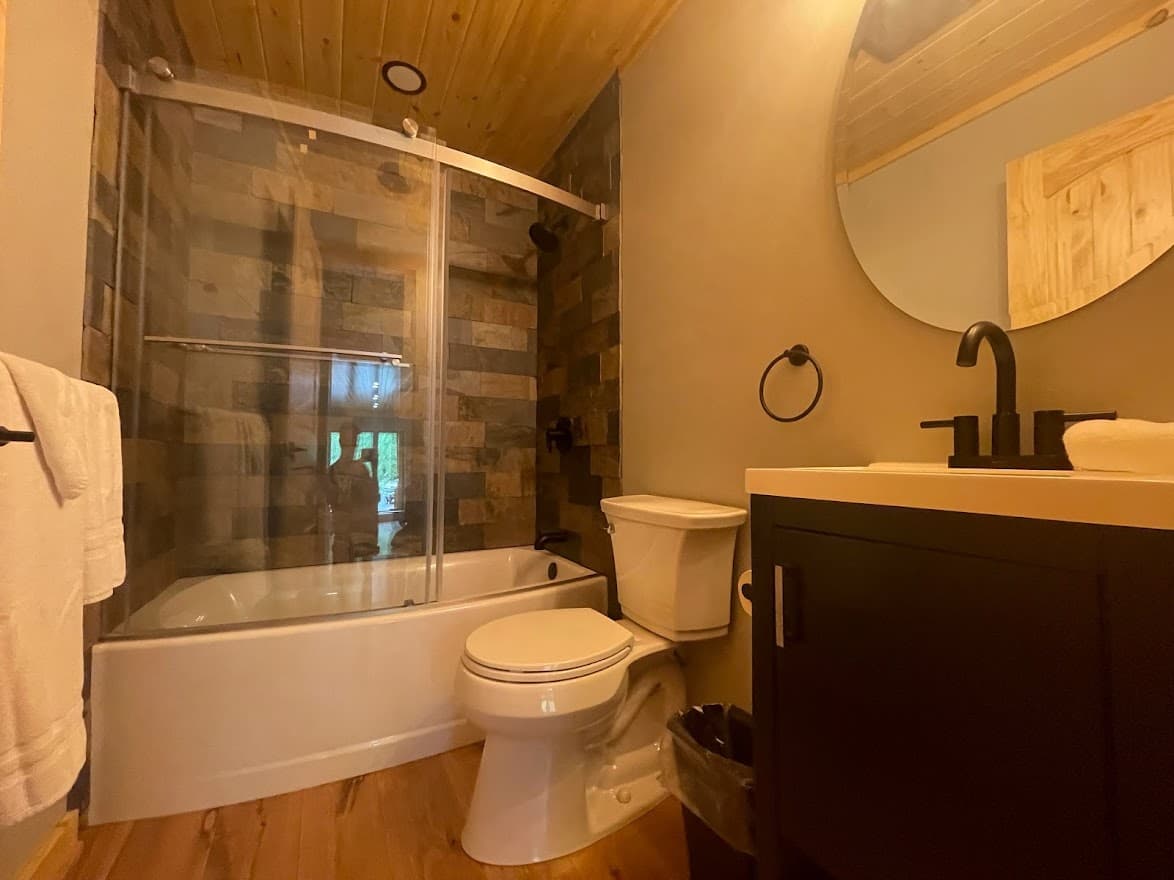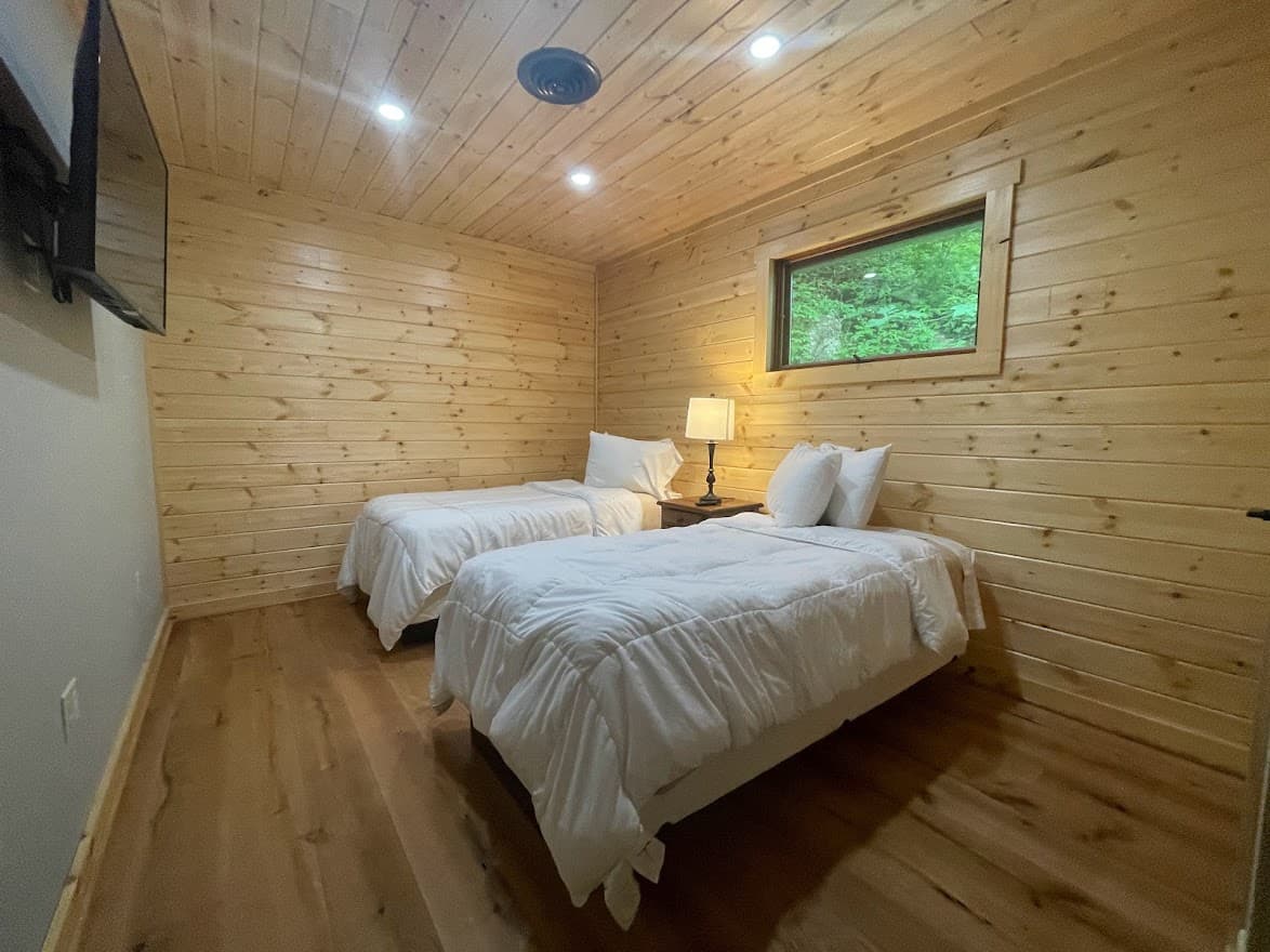 Riverside RetreatDiscover our newly remodeled Riverfront SPA-Lux cabin, featuring two bedrooms and two full baths. Enjoy a kitchen with granite countertops and a spacious great room highlighted by a rock fireplace. The Master Bedroom Luxury Suite boasts river views, a King-sized bed, a soaker tub, and a luxury slate 2-person shower, with secret access to the private outdoor hot tub. The second bedroom offers two twin beds and a separate full bathroom. Experience luxury and relaxation in this serene riverside getaway.