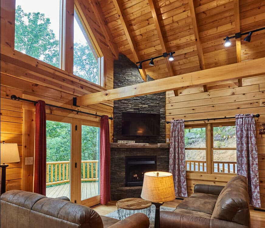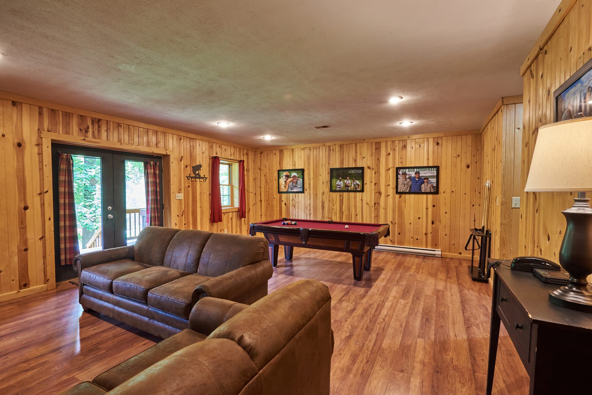 Mountain LaurelSecluded SPA-Lux Log Cabin with InfraRed Sauna and three bedrooms. The kitchen has granite counters, stainless appliances and gas stove a convection oven, a great room with a rock fireplace, basement with wet bar, giant 70″ HDTV, pool and ping pong table.