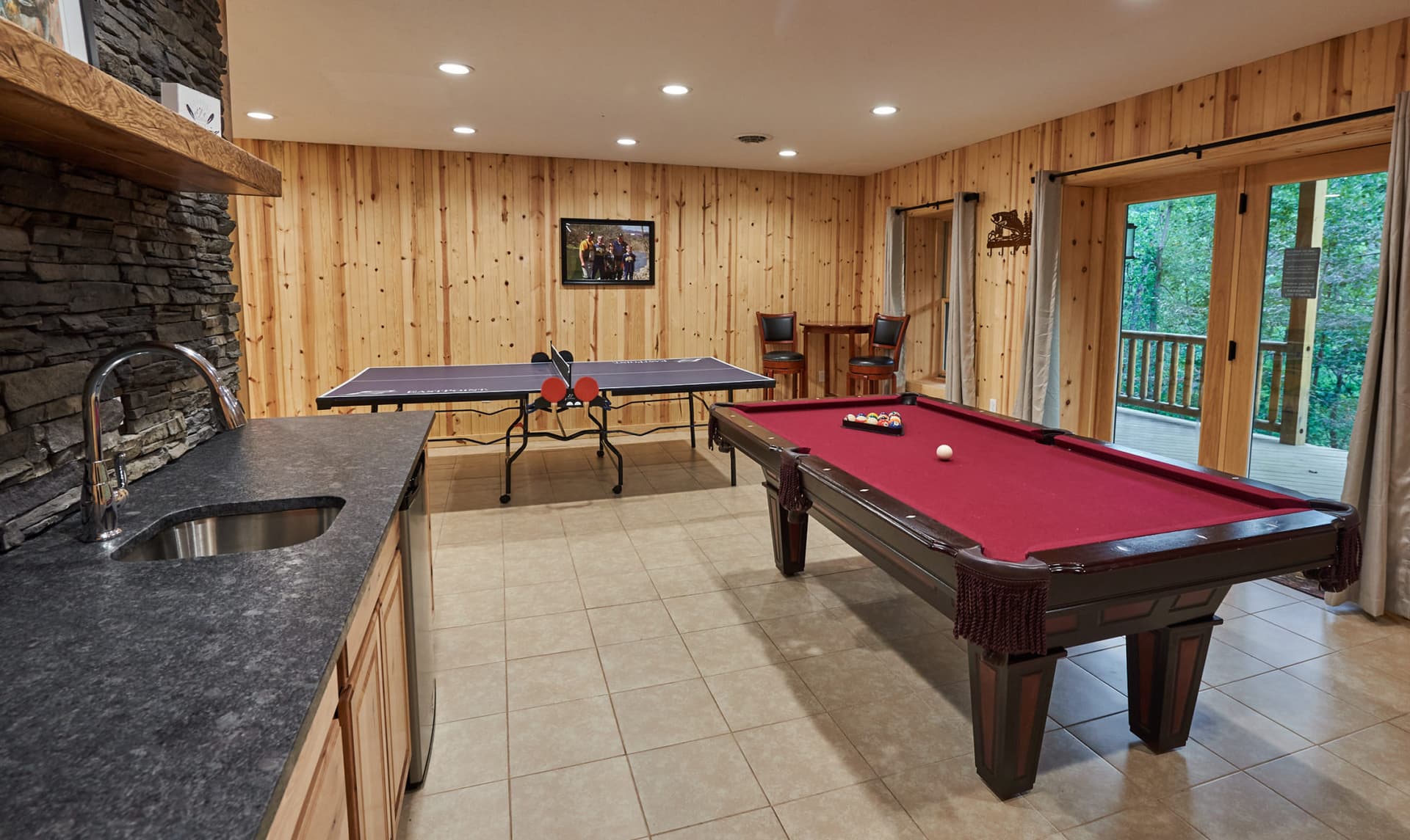 Secluded SPA-Lux Log Cabin with InfraRed Sauna and three bedrooms. The kitchen has granite counters, stainless appliances and gas stove a convection oven, a great room with a rock fireplace, basement with wet bar, giant 70″ HDTV, pool and ping pong table.