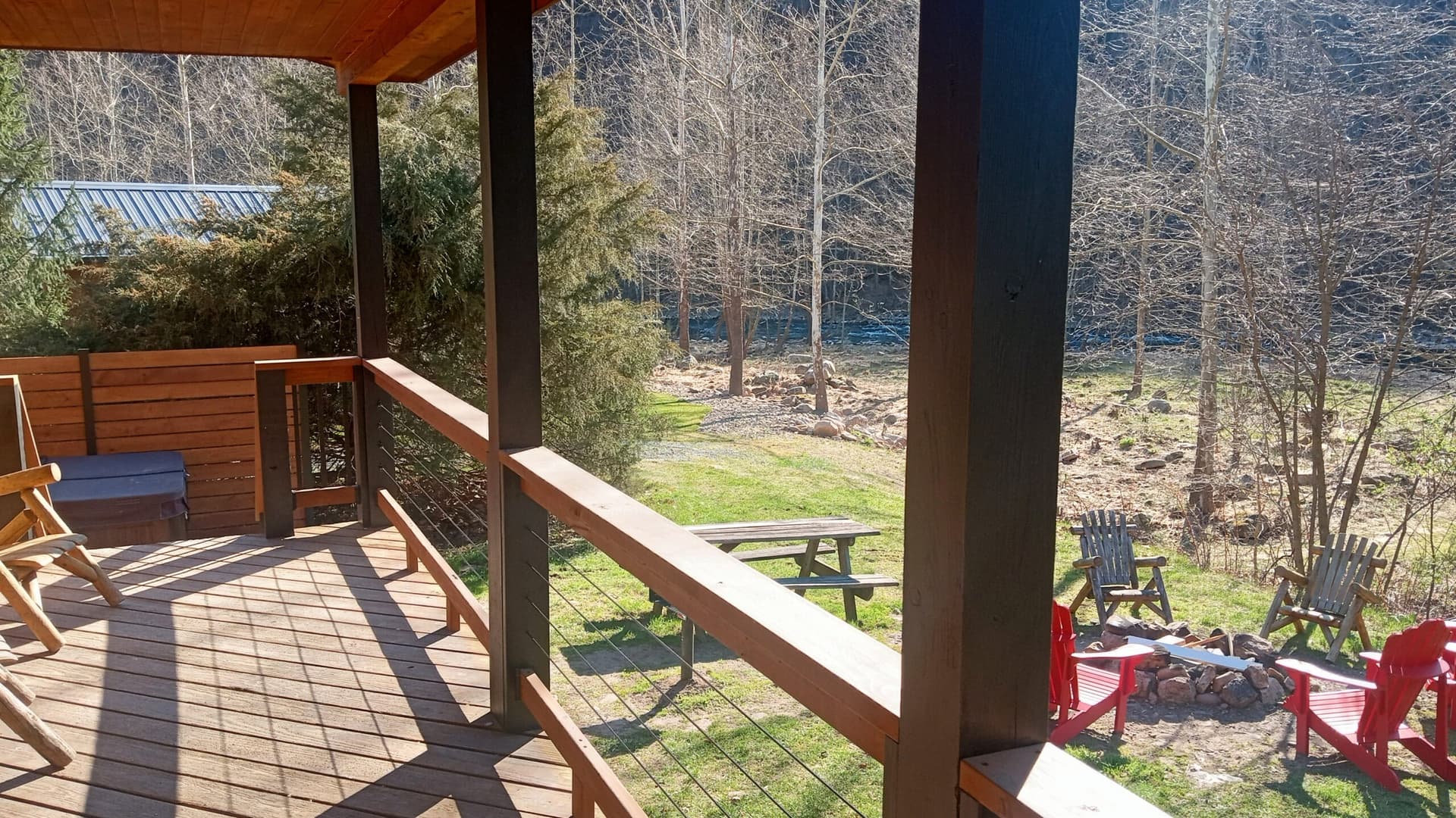 Step outside to enjoy your private outdoor hot tub, or relax on the porch swing and log chairs. Evenings are made perfect with an outdoor fire pit and charcoal grill for classic mountain cookouts.