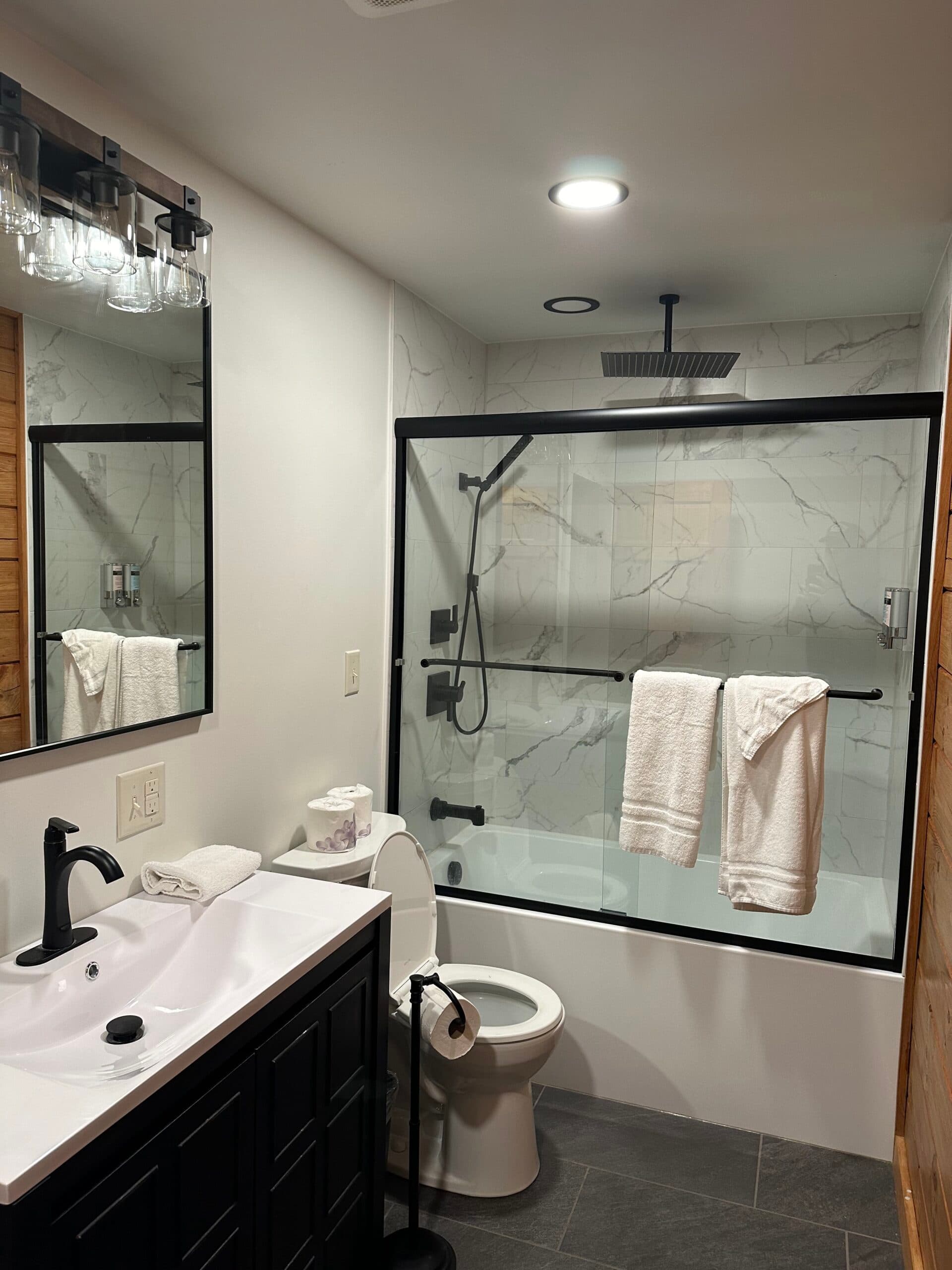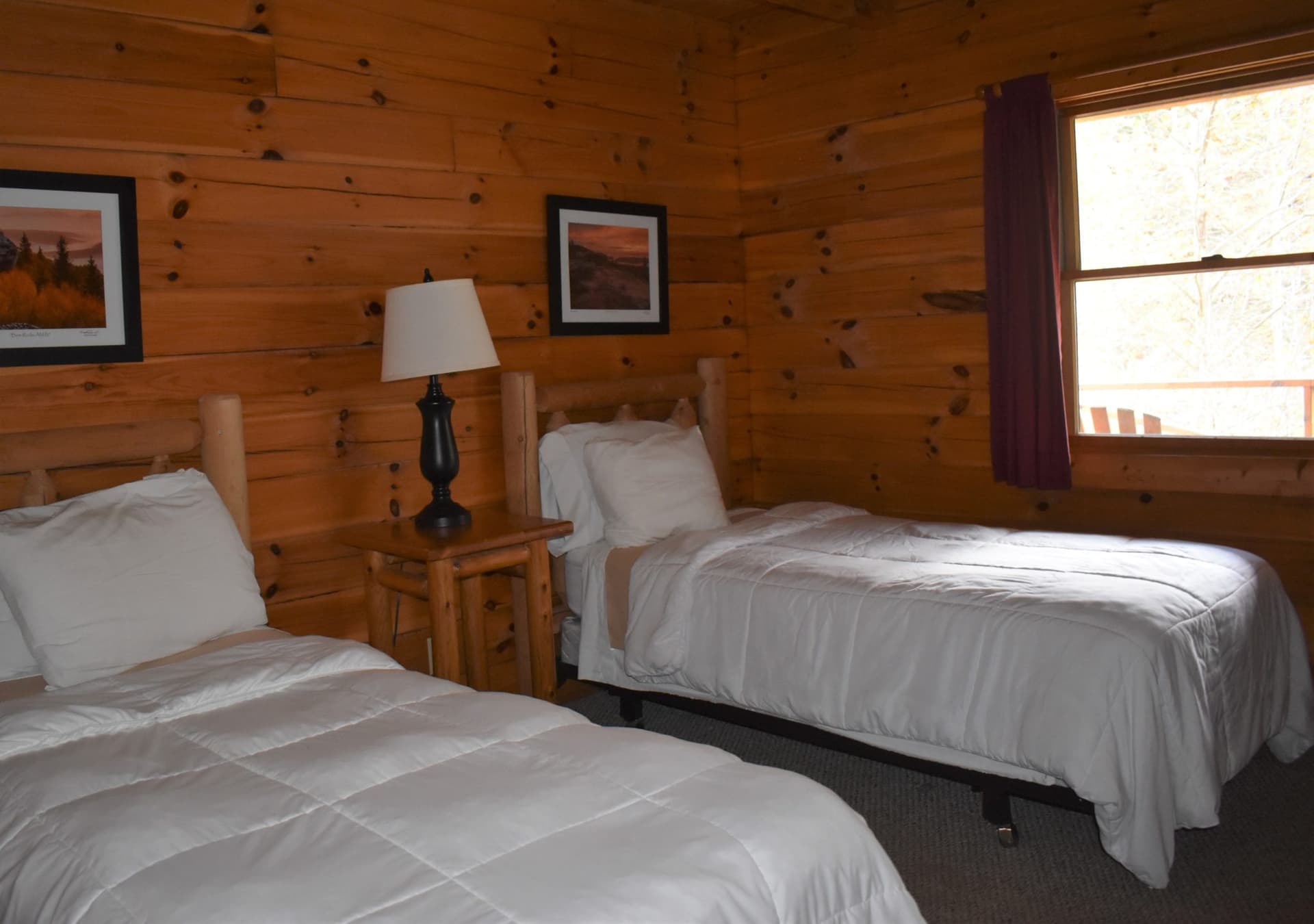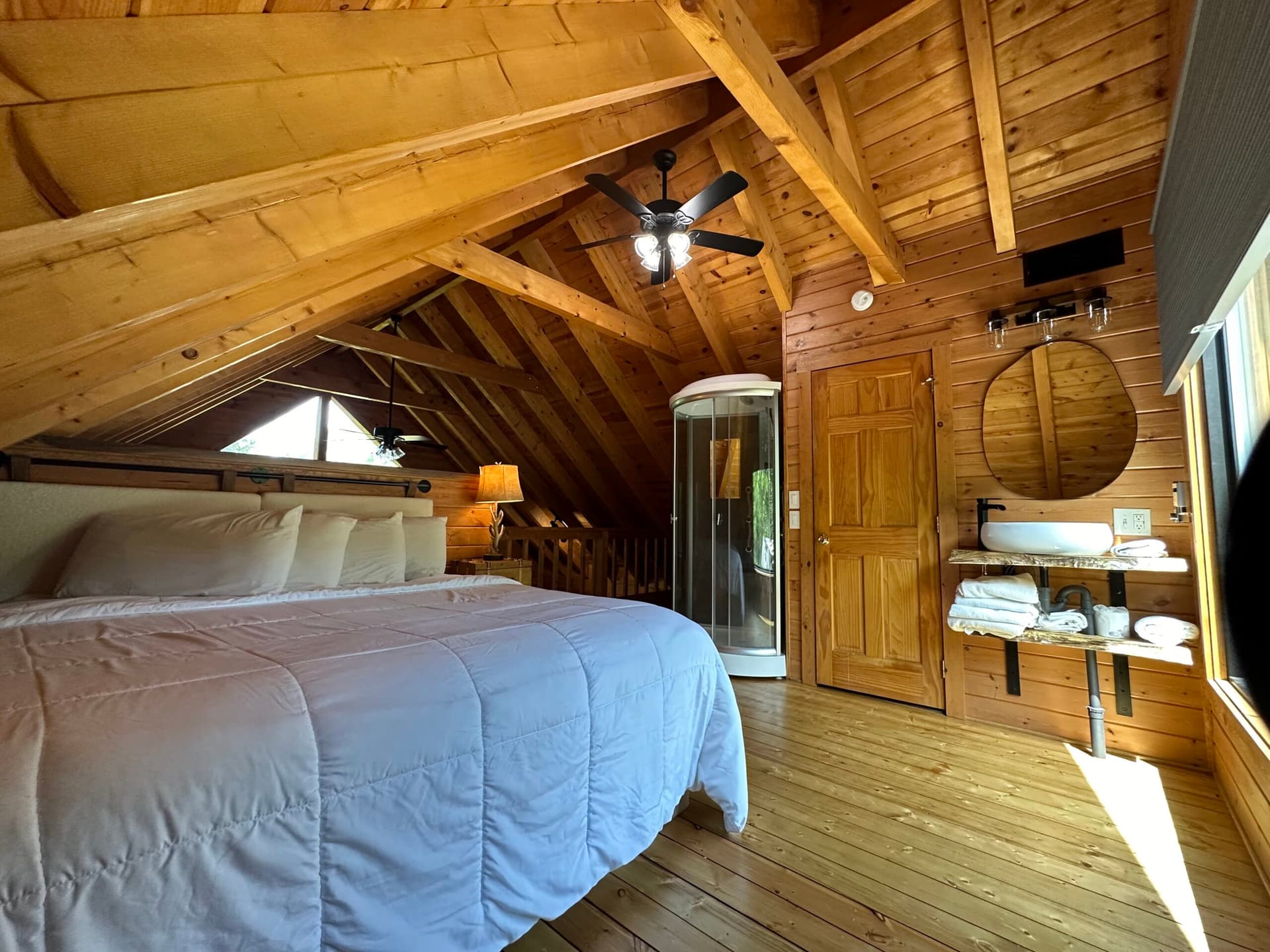Cabin #13 has been beautifully updated to offer a Spa Lux experience, ideal for couples or small families seeking comfort and relaxation. The master suite is located in the loft, featuring a King-size bed and a spa-style bath complete with a walk-in rain shower, creating a serene retreat.