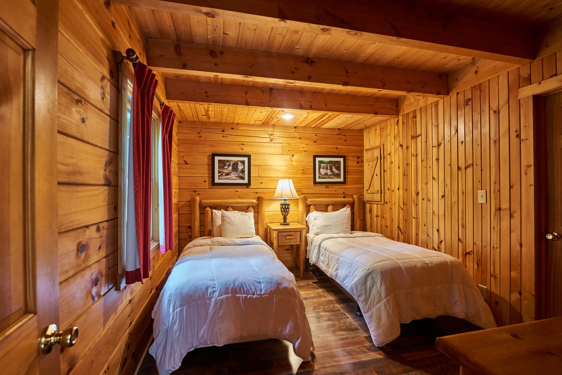 Cabin #15 is a spacious three-bedroom log cabin, perfect for families or groups looking to relax and reconnect in the mountains. The main level features two bedrooms—one with a Queen bed and the other with two twin beds. The master bedroom is located in the loft, offering a King bed and a private full bathroom.