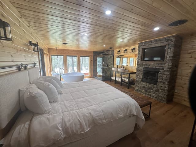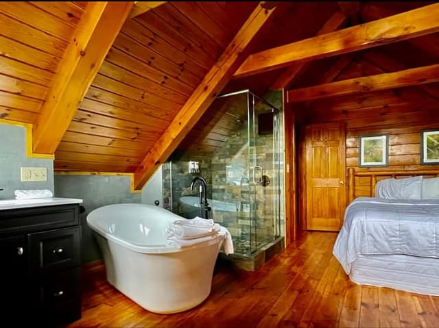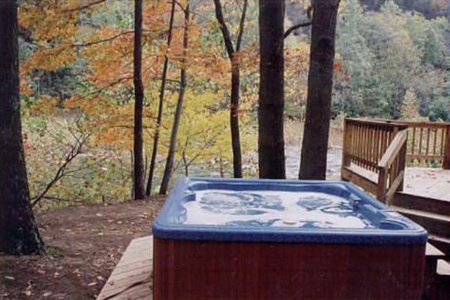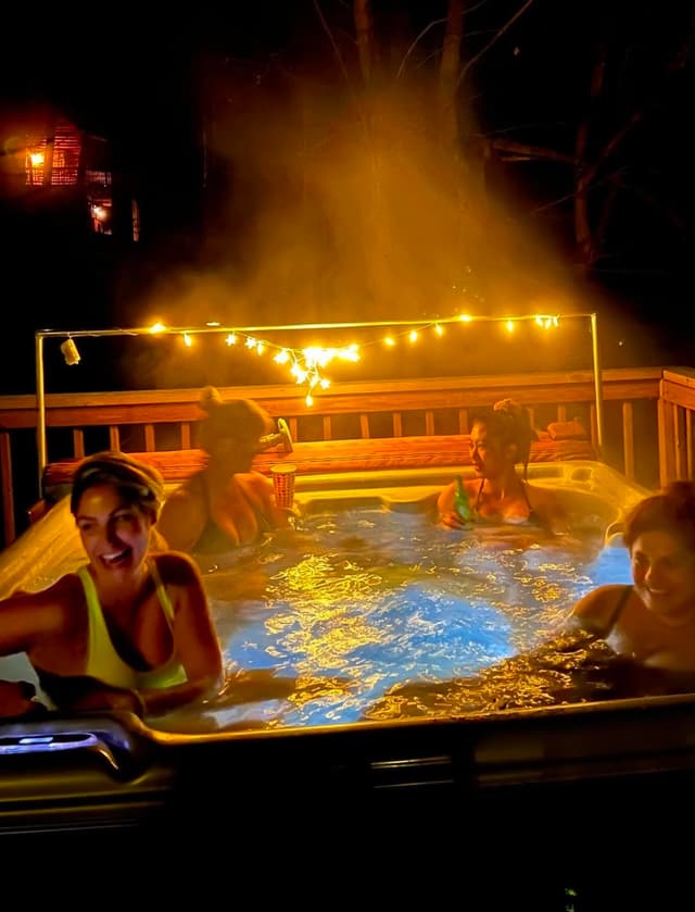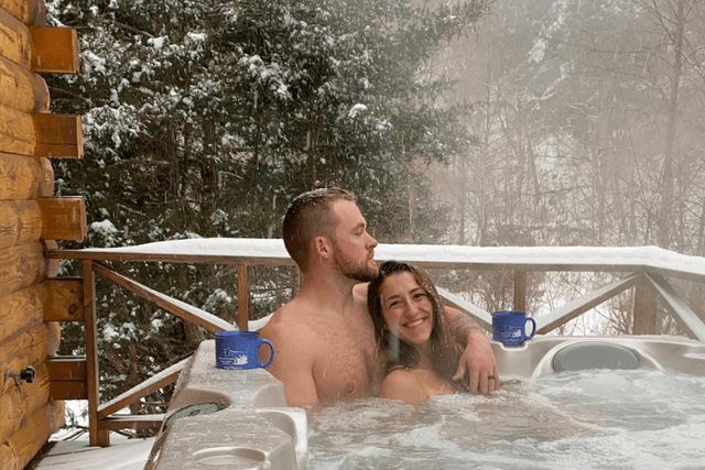 Romantic couple spending time in the outdoor private hot tub at one of Harman's West Virginia cabin rentals.