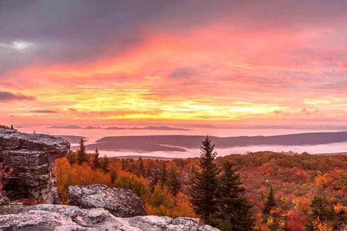 Bear Rocks features beautiful vistas of New Creek Mountain, North Fork River Valley, and the North Fork Mountain Range. One of the most photographed places in the state, Bear Rocks is a haunting barren landscape of boulders, spruce trees, and bogs.