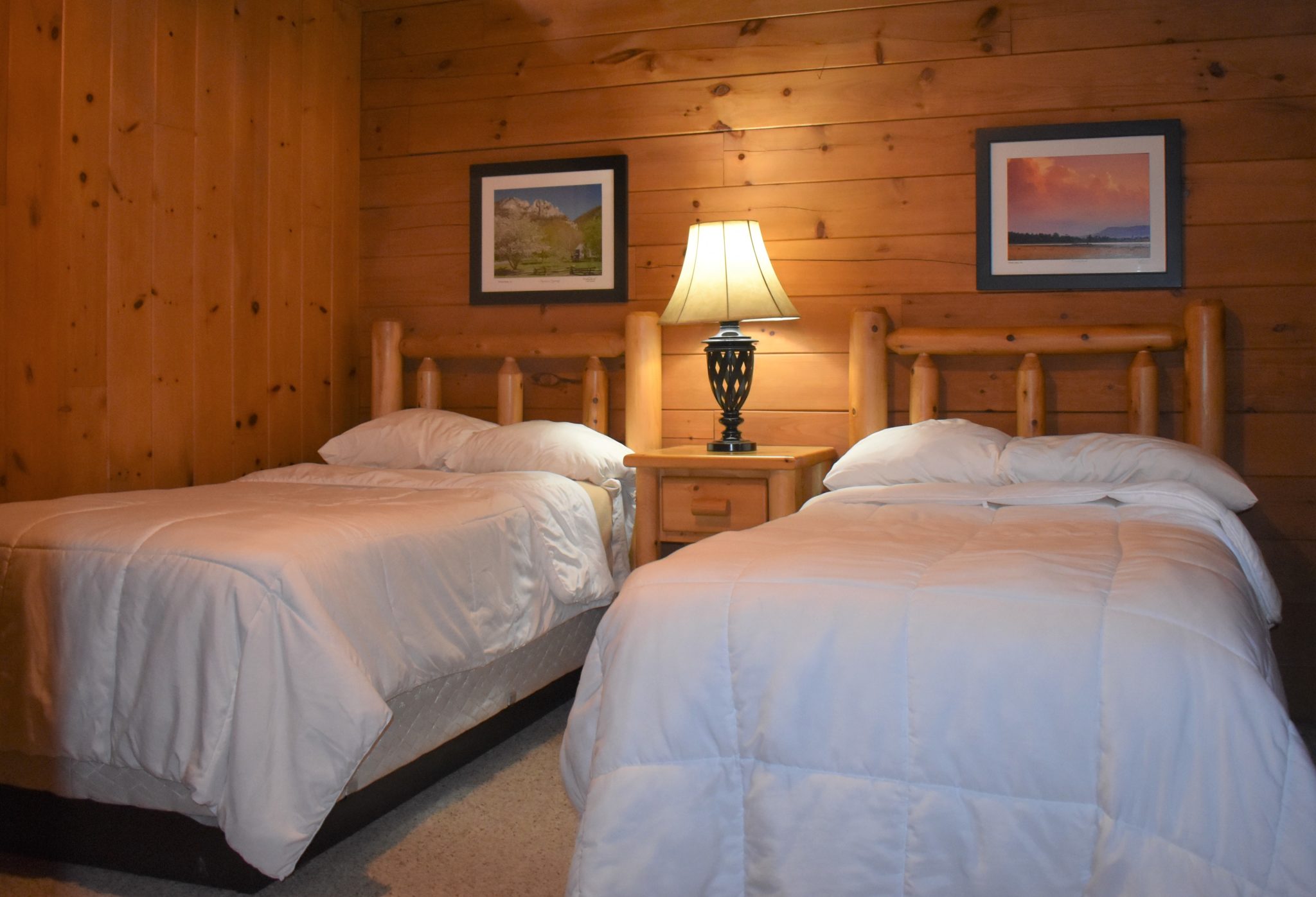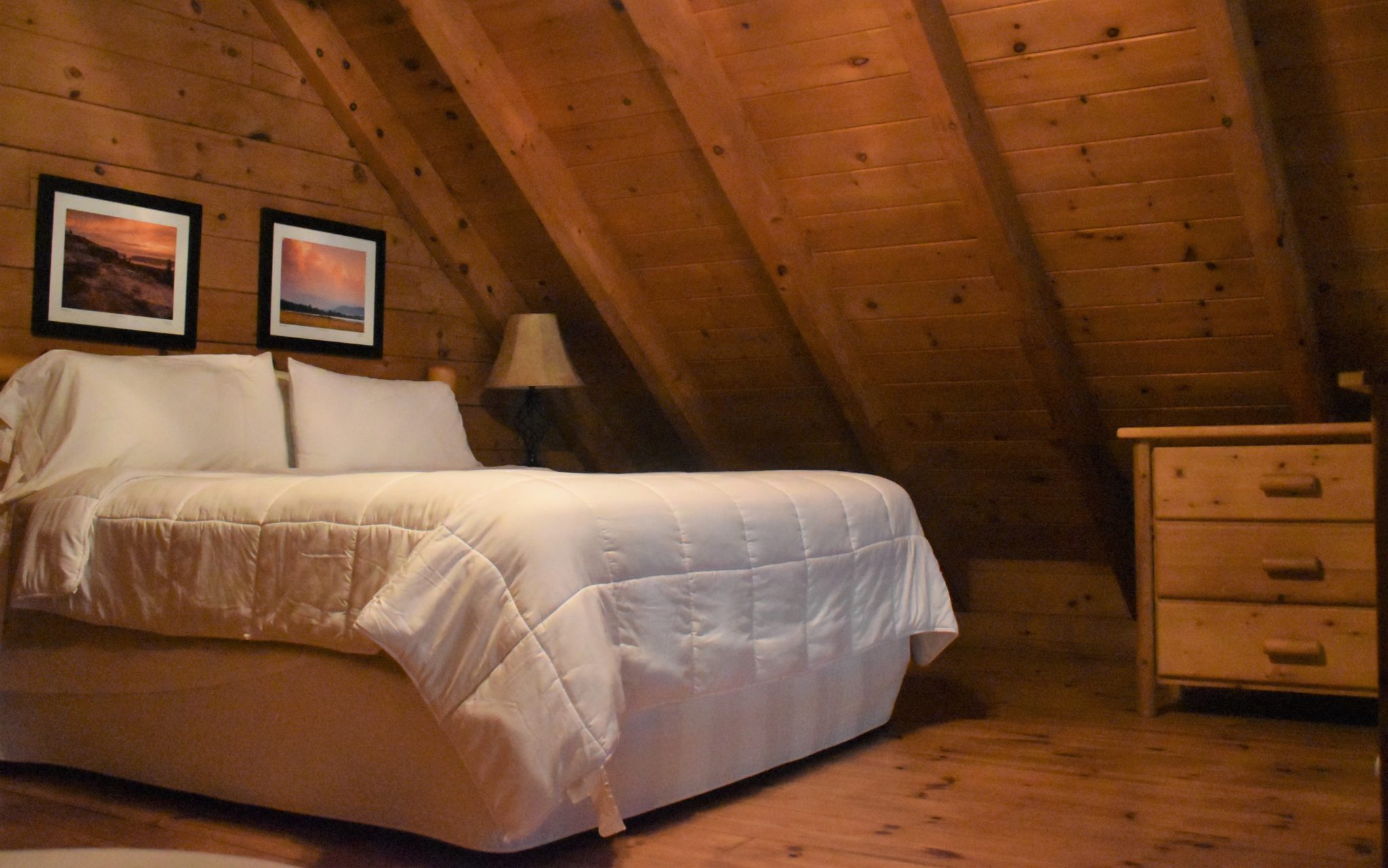 Spacious and inviting, Cabin #1 is perfect for families or groups. This charming 3-bedroom log cabin offers two bedrooms on the main level—one with a Queen bed and the other with two twin beds. The master suite is located in the loft and features a luxurious King bed, a private Jacuzzi tub, and a half bath.