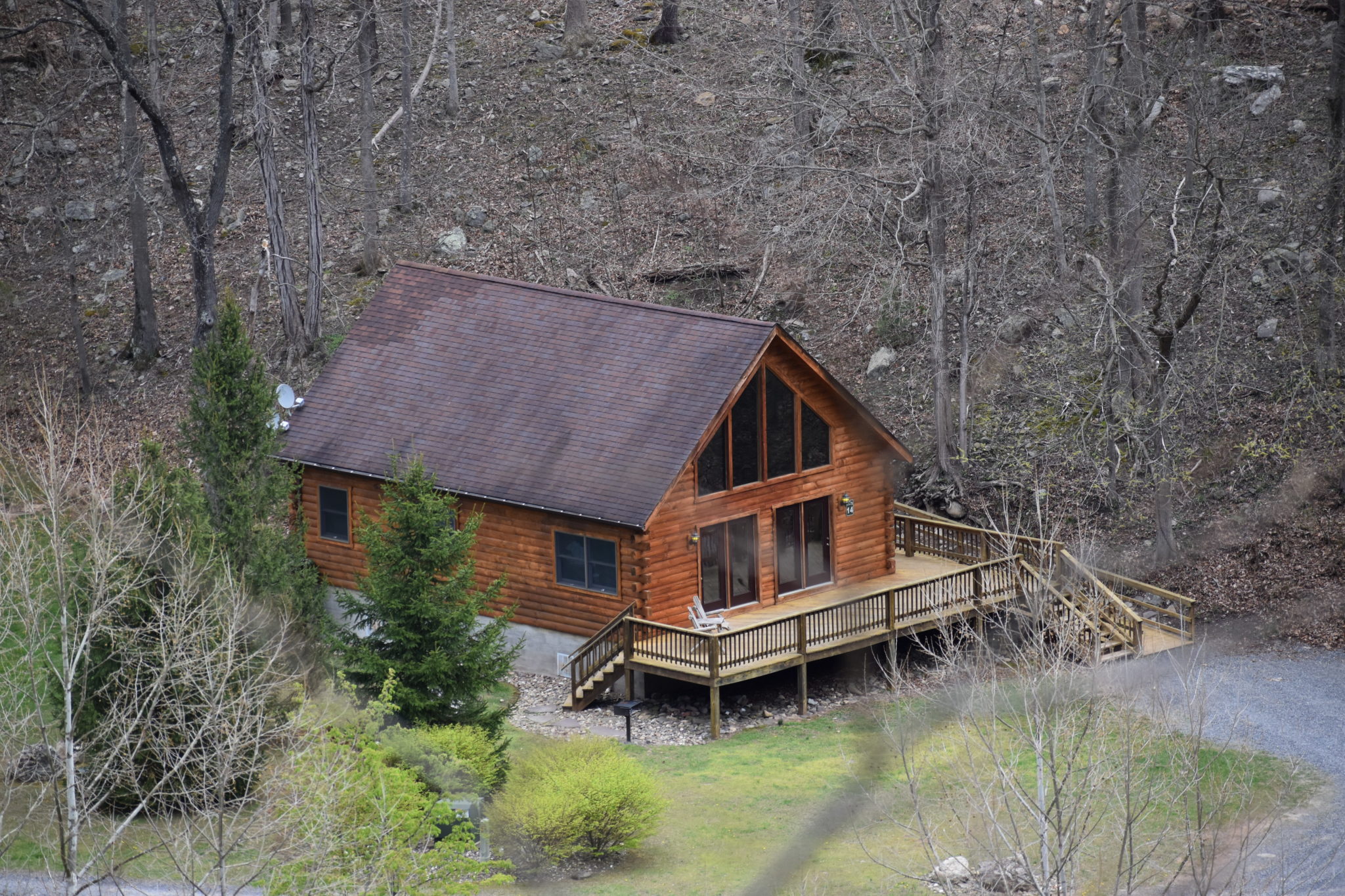 Cabin #14 is a cozy and comfortable 3-bedroom log cabin, perfect for families or small groups. This cabin features two bedrooms on the main level—one with a Queen-size bed and the other with two twin beds. The master bedroom is located in the loft and offers a King-size bed along with a full bathroom.
