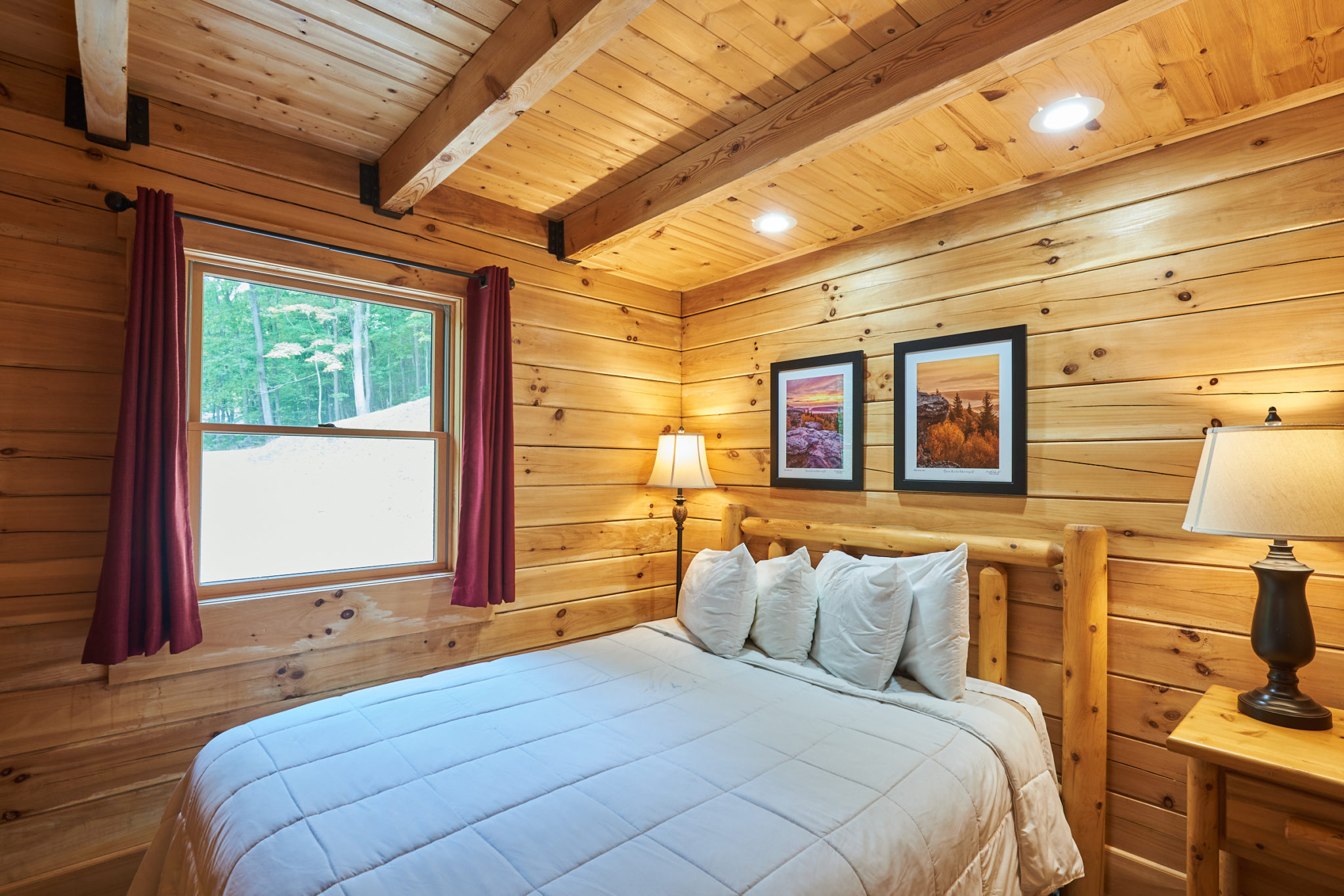 Cabin #15 is a spacious three-bedroom log cabin, perfect for families or groups looking to relax and reconnect in the mountains. The main level features two bedrooms—one with a Queen bed and the other with two twin beds. The master bedroom is located in the loft, offering a King bed and a private full bathroom.