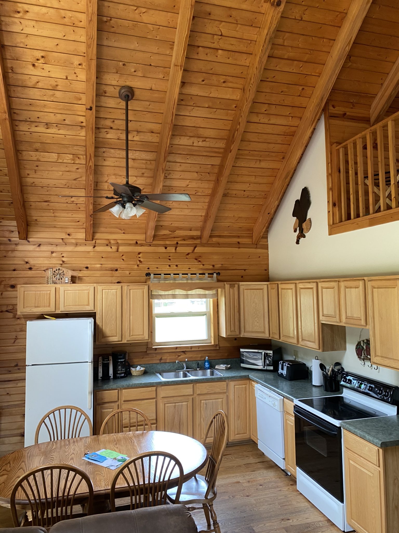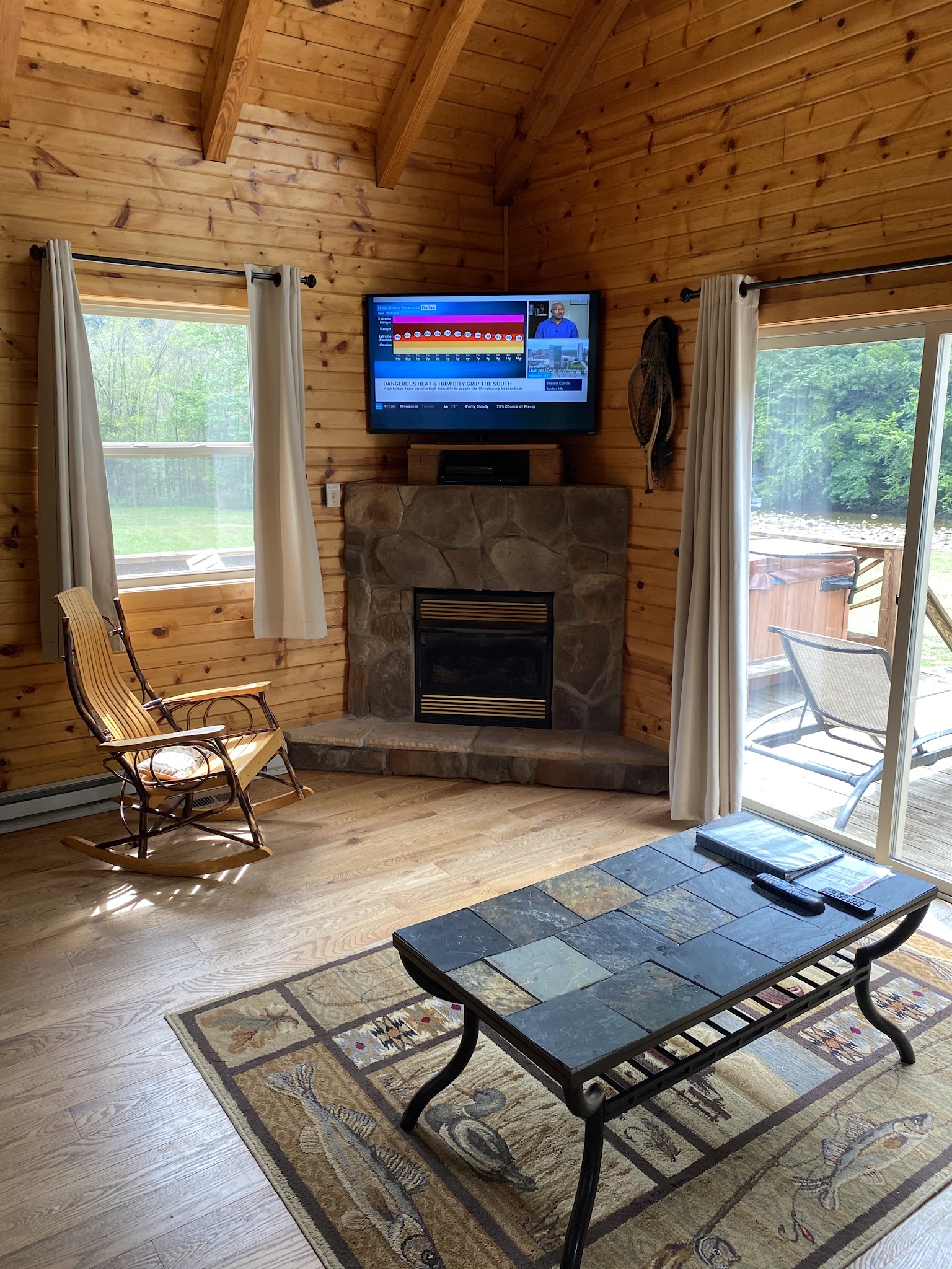 The living area includes a gas log fireplace, satellite TV, and a welcoming space to relax after a day of fishing, hiking, or exploring. Guests will also enjoy the convenience of a washer and dryer and a fully equipped kitchen.