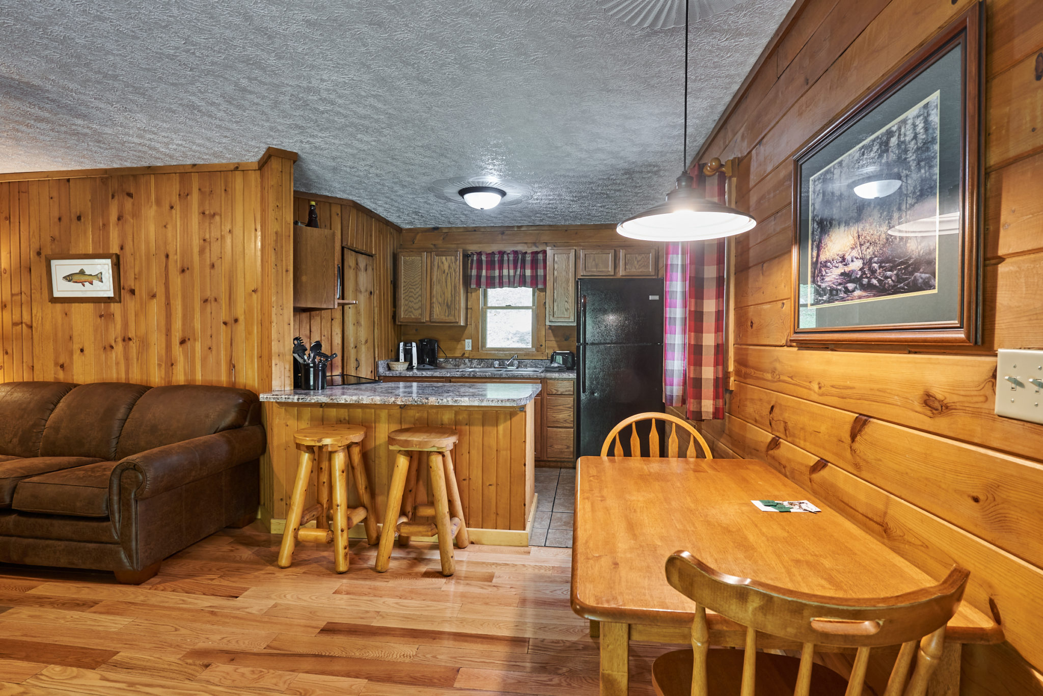Perfect for a romantic escape or peaceful solo retreat, Cabin #4 is a cozy 1-bedroom log cabin featuring a King-size bed and a full bathroom. Relax in the Jacuzzi tub, or unwind by the warm glow of the gas log fireplace while streaming your favorite shows on the satellite Roku TV.